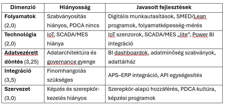 - Technológia: 2,0 → 3,7 (IoT, SCADA/MES, integráció)